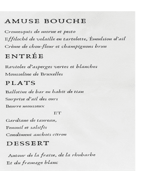 Comment décrire le déjeuner lui-même en quelques mots ? Tout d’abord par le menu de ce jour-là, indiqué ci-après. Ensuite, par la présentation très recherchée de chaque plat et enfin, par les saveurs à la fois délicieuses et subtiles qui ont enchanté nos papilles.