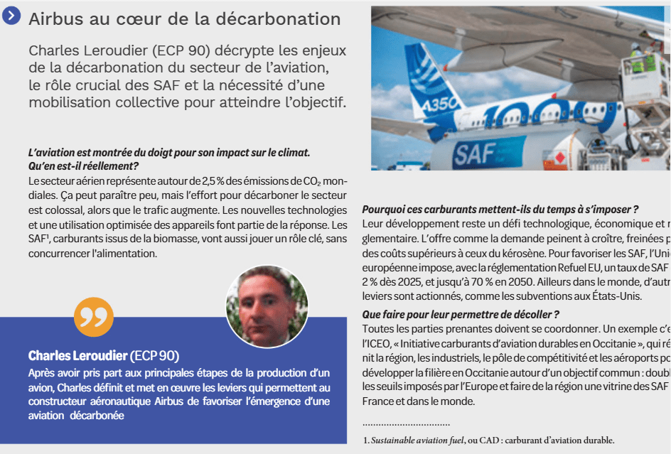Notre camarade Charles Leroudier (ECP 90) développe lors d'une conférence le thème de la décarbonation de l'aviation, à la suite d'une première publication dans le numéro spécial « Occitanie » de la revue CSA, parue à l'été 2026 (cf. pj).